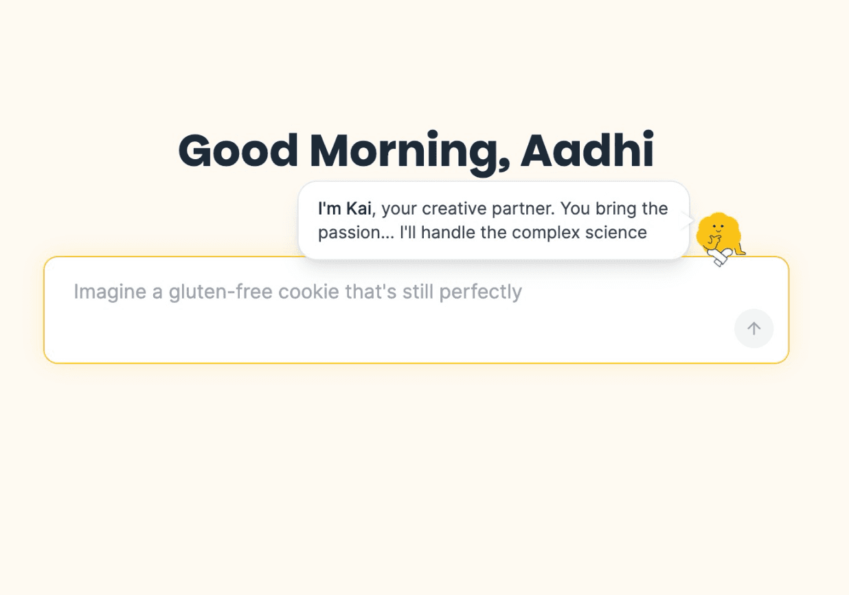 The platform uses a four-question conversational flow to define the product idea, sensory preferences, dietary constraints, and desired budget/profit margin. Kai takes care of rest of the things!